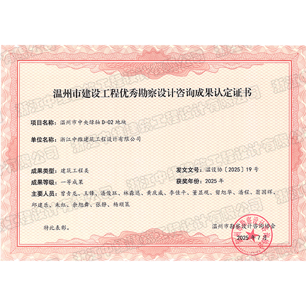 2025温州市中央绿轴D-02地块-温州市建设工程优秀勘察设计咨询成果认定证书-建筑工程设计类-一等成果