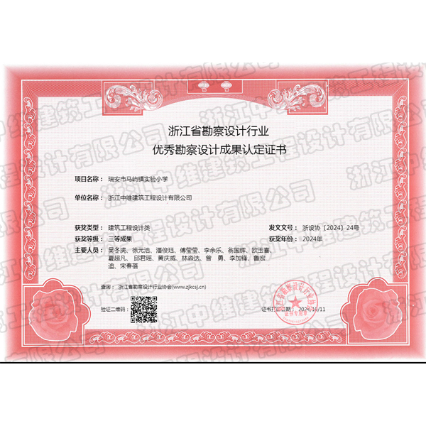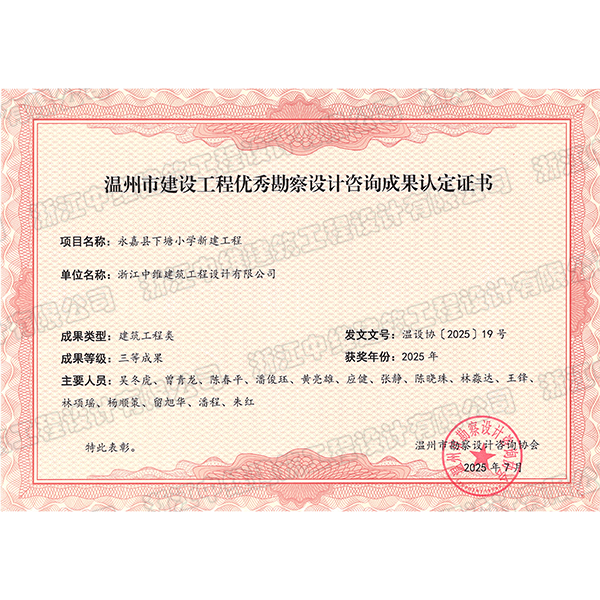 2025永嘉县下塘小学新建工程-温州市建设工程优秀勘察设计咨询成果认定证书-建筑工程设计类-三等成果