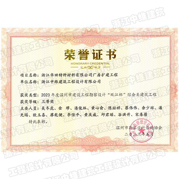 2023浙江华田特种材料有限公司厂房扩建工程-“瓯江杯”综合类建筑工程三等奖