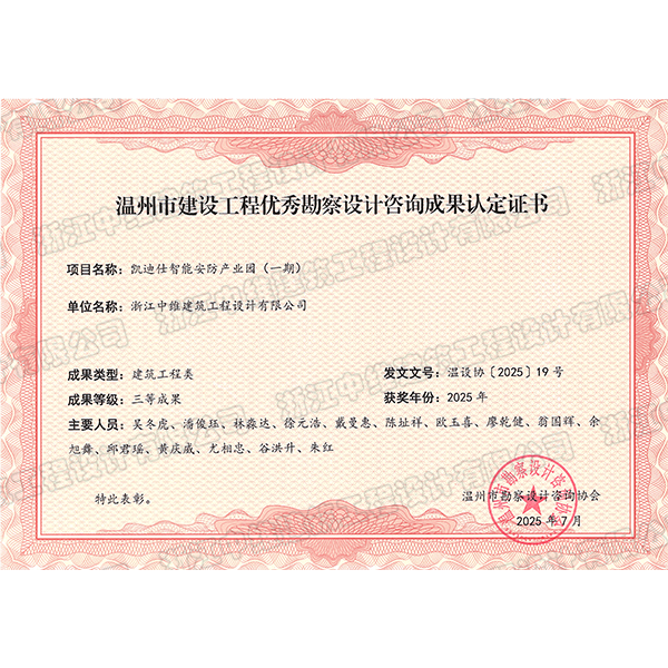 2025凯迪仕智能安防产业园(一期)-温州市建设工程优秀勘察设计咨询成果认定证书-建筑工程设计类-三等成果